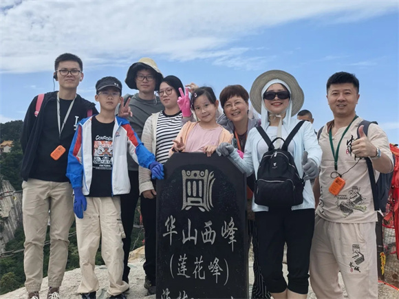 途中,大家或三兩好友結(jié)伴同行;或幾人前后跟隨;或駐足留念拍照,一覽華山全貌,不禁學(xué)著導(dǎo)游的口音玩笑一句:“這就是額給你們打下的江山啊!”