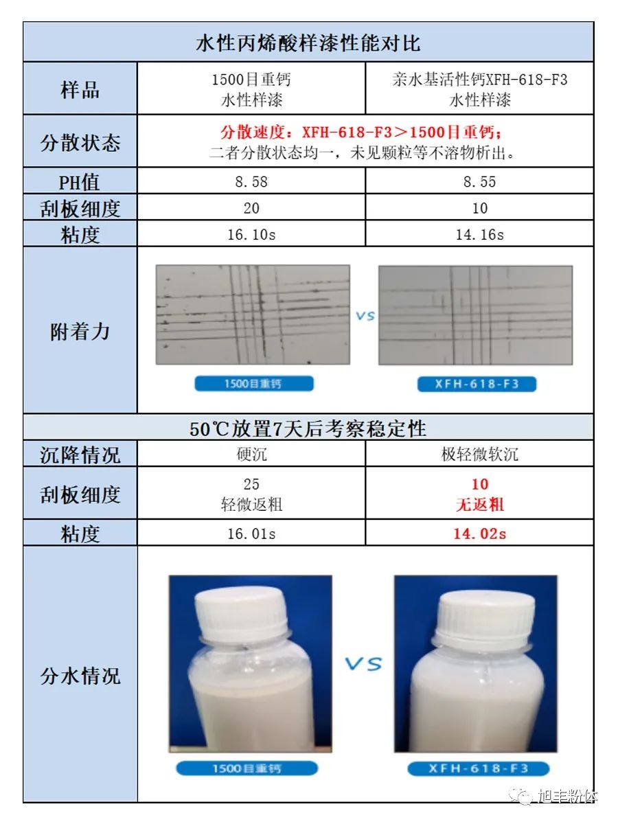 對比可知:親水基活性鈣XFH-618-F3比普通1500目重鈣潤濕速度快、分散效果好,附著力及儲存穩(wěn)定性提高。更多應(yīng)用信息或獲取樣品請來電咨詢,旭豐粉體竭誠為您服務(wù)!